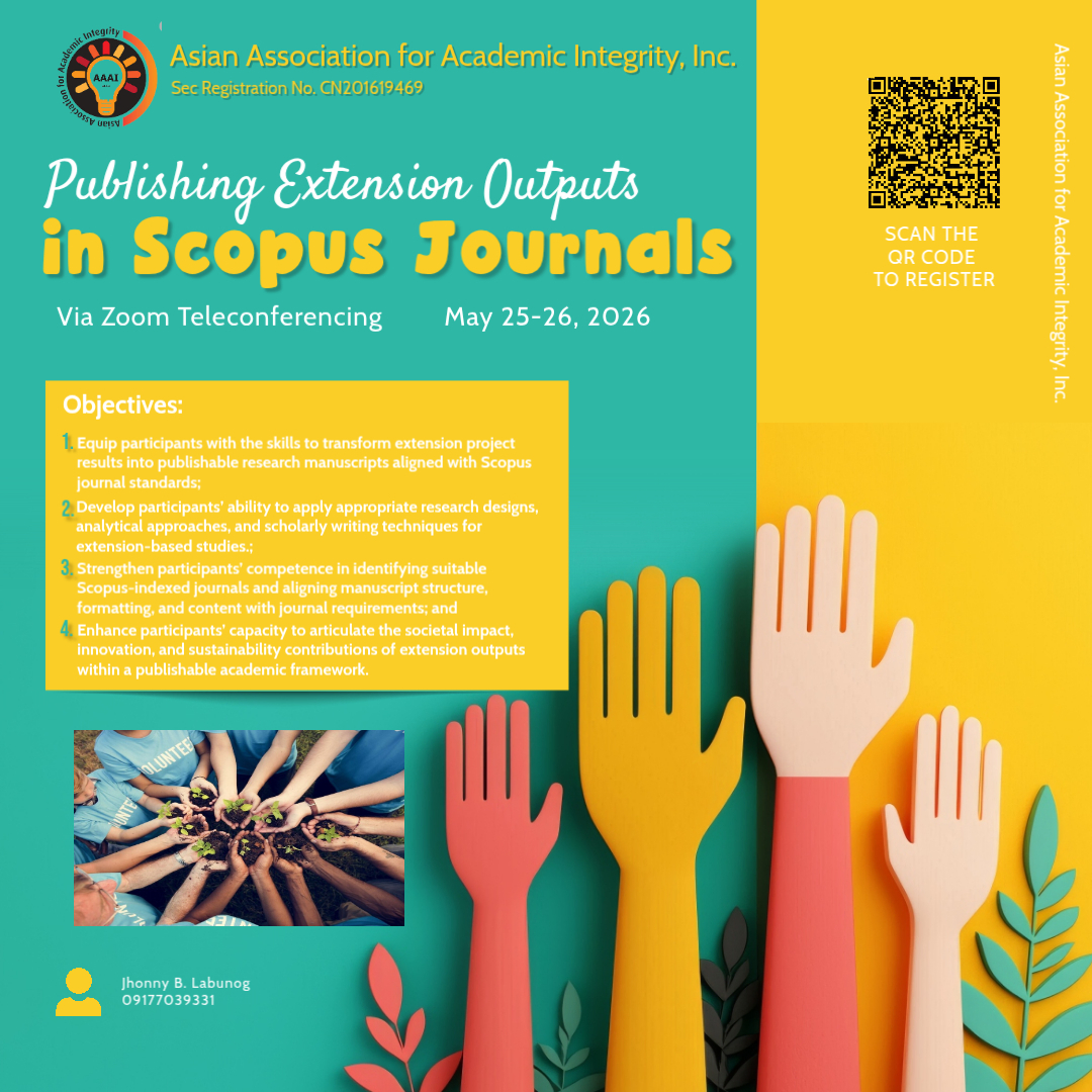 The Association of Academic and Administrative Institutions (AAAI) with the SEC Registration No. CN201619469 is inviting you to participate in the Publishing Extension Outputs in Scopus Journals on May 25-26, 2026 via Zoom Teleconferencing.