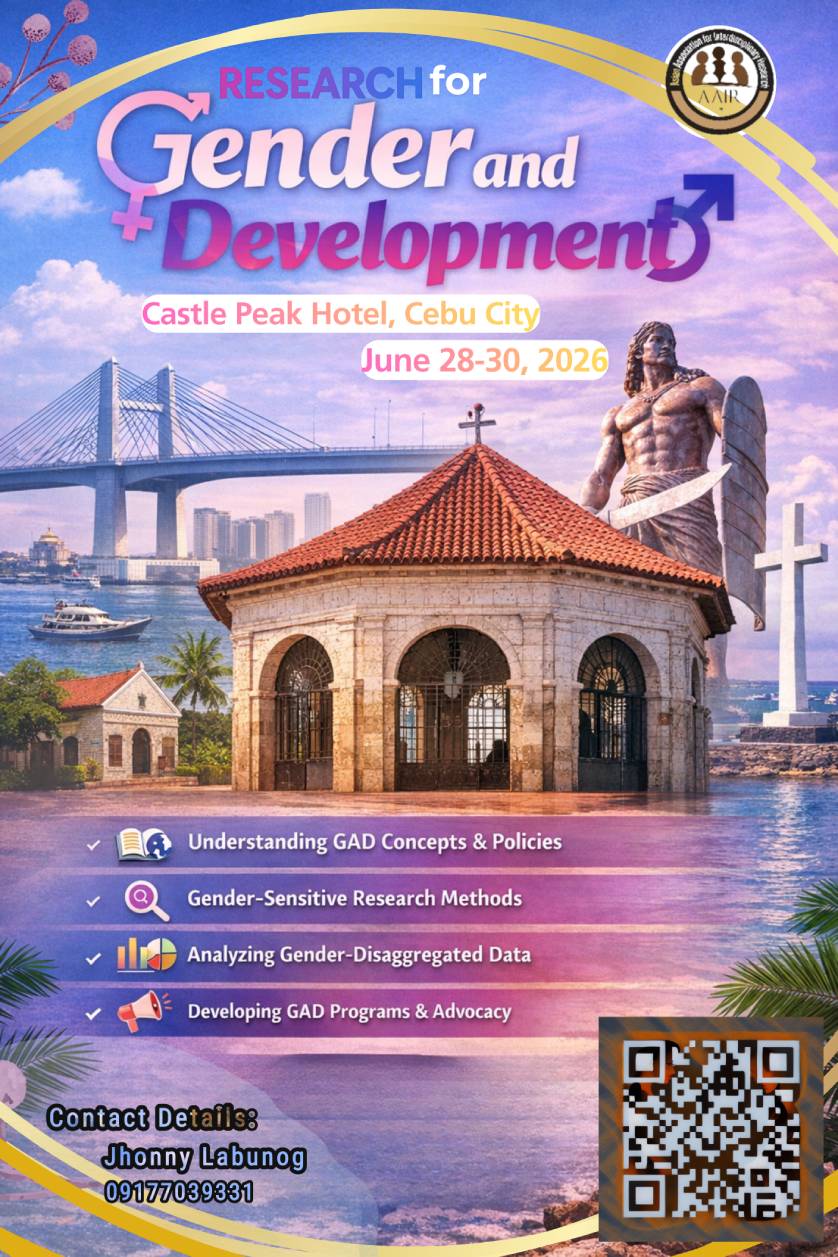 The Asian Association of Interdisciplinary Research, Inc. (AAIR, Inc.) with SEC Registration No. CN201619459 is inviting you to participate in the training workshop on “Research for Gender and Development” on June 28-30, 2026 at Castle Peak Hotel, Cebu City, Philippines.