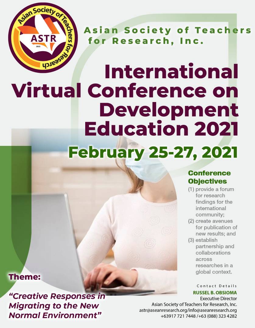 Fresh from the success of the 4th Asian Virtual Conference on Institutional and Action Research virtually participated by more than 70 presenters, speakers and guests from from the Philippines, Malaysia, Indonesia, Egypt, United Arab Emirates, and Mexico on January 20-22, 2022, the Asian Society of Teachers for Research, Inc. together with its co-host institution, the Philippine School Doha, invite researchers, scholars and educators to the 3rd International Virtual Conference on Development Education (IVCDE 2022) on April 6-8, 2022, which will be conducted virtually via ZOOM Teleconferencing.