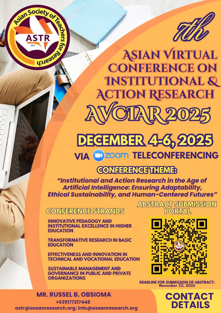 From the success of the 2nd International Virtual Conference on Development Education (IVCDE 2021) on February 25-27, 2021 virtually attended by more than 90 presenters, guests, observers, and speakers from the Philippines, Cambodia, Qatar, United Arab Emirates and the United States of America, the Asian Society of Teachers for Research, Inc. once again invites researchers, scholars and educators to the 4th Asian Virtual Conference on Institutional and Action Research 2022 (AVCIAR 2022) on January 20-22, 2022 which will be conducted virtually via ZOOM Teleconferencing. virtually via ZOOM Teleconferencing.