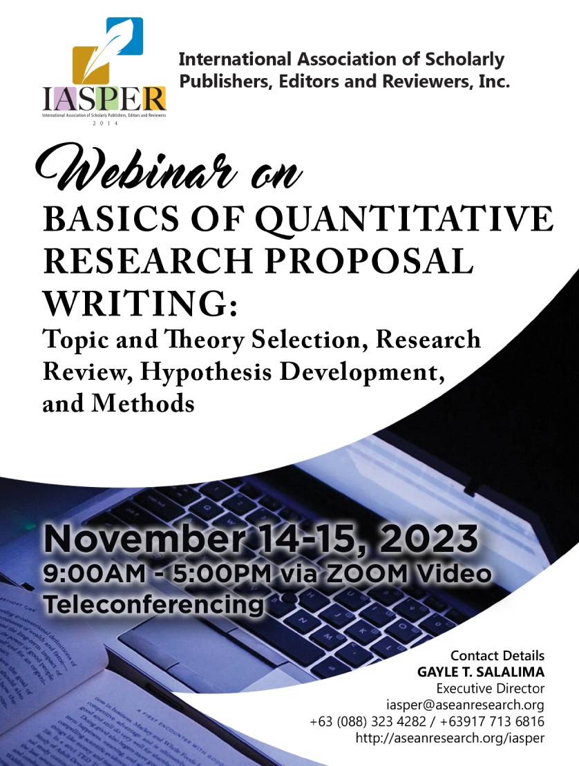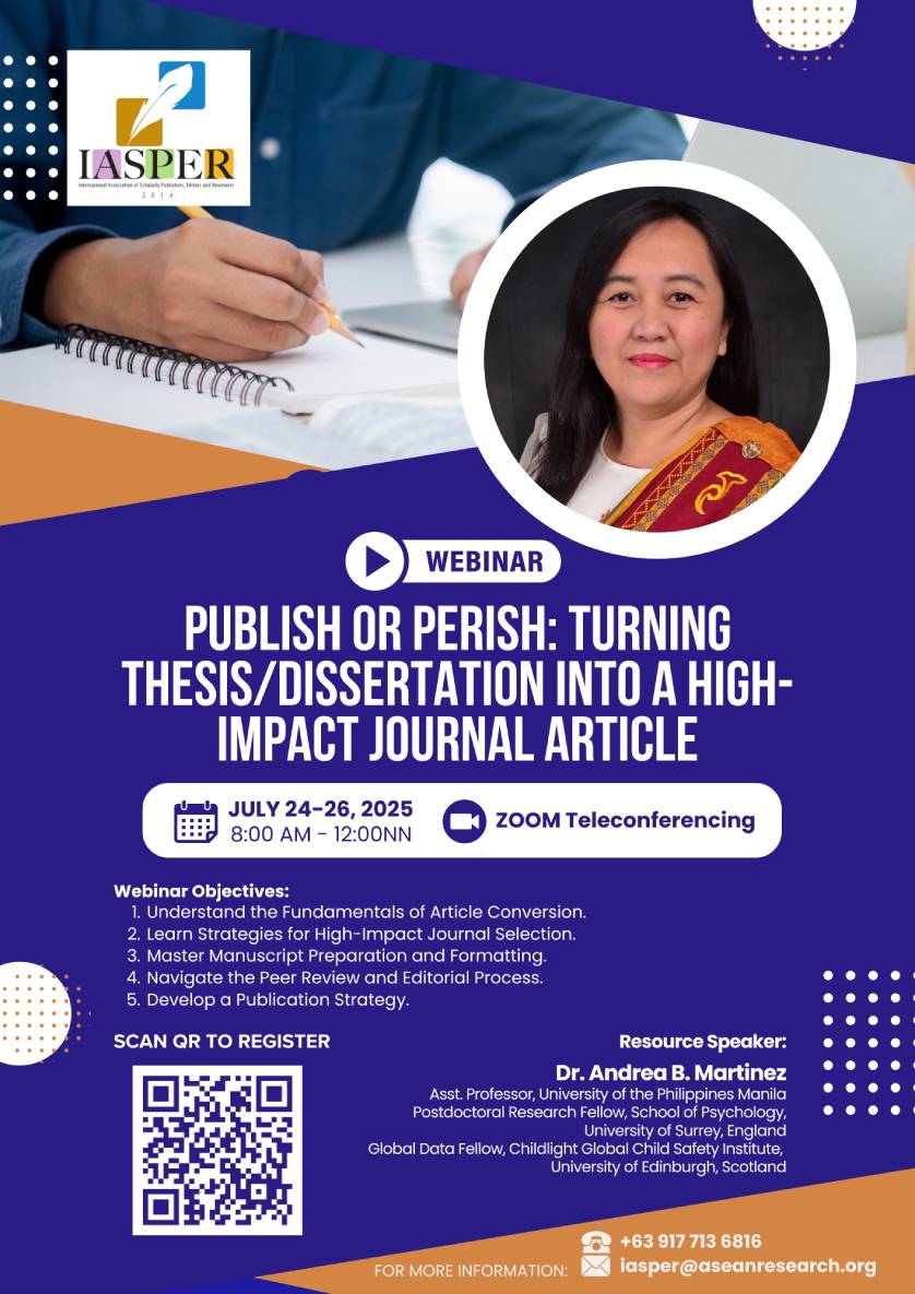 The International Association of Scholarly Publishers, Editors and Reviewers (IASPER) with the SEC Registration No. CN201433407 is inviting you to participate in the Webinar on Scale Development Techniques in Social Sciences on November 14-15, 2024 through ZOOM Video Teleconferencing.
