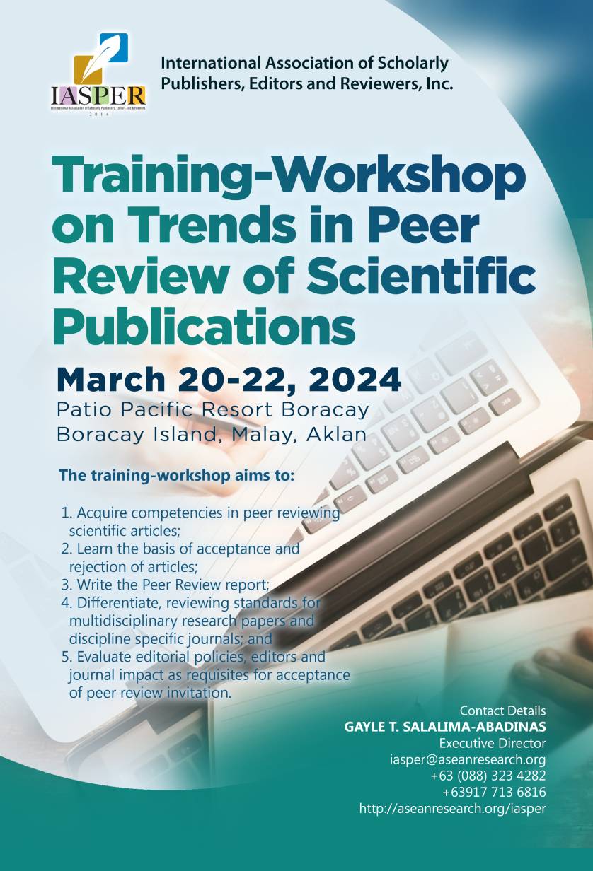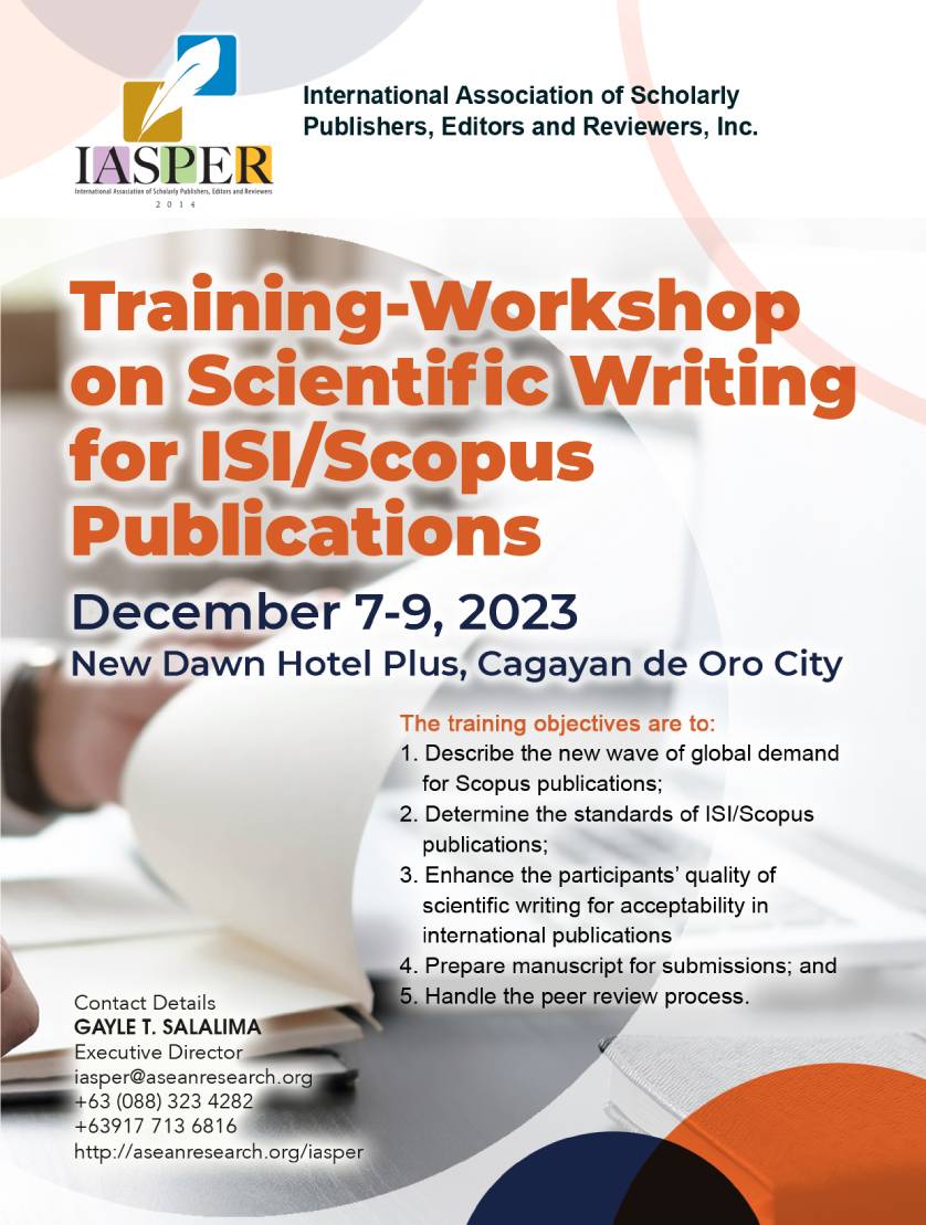 The International Association of Scholarly Publishers, Editors and Reviewers (IASPER) with the SEC Registration No. CN201433407 is inviting you to participate in the Training-Workshop on Scientific Writing for ISI/Scopus Publications on December 7-9, 2023 at New Dawn Hotel Plus, Cagayan de Oro City, Philippines.