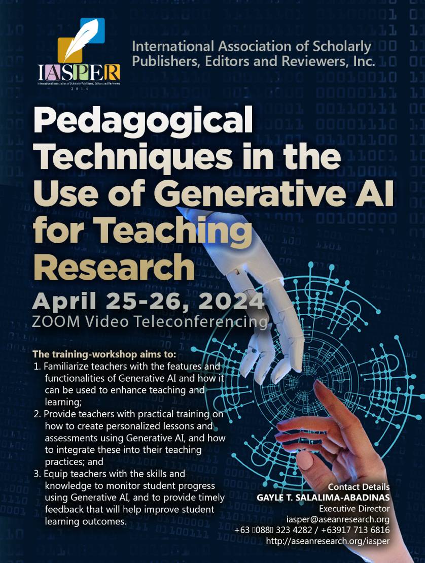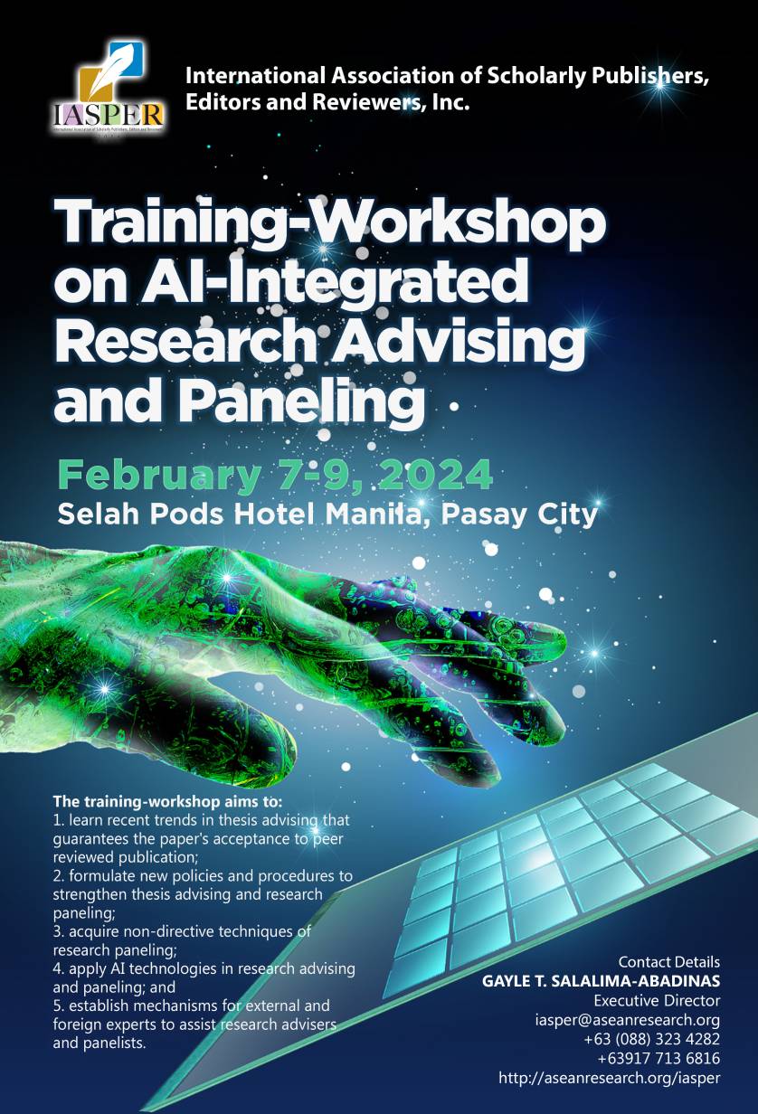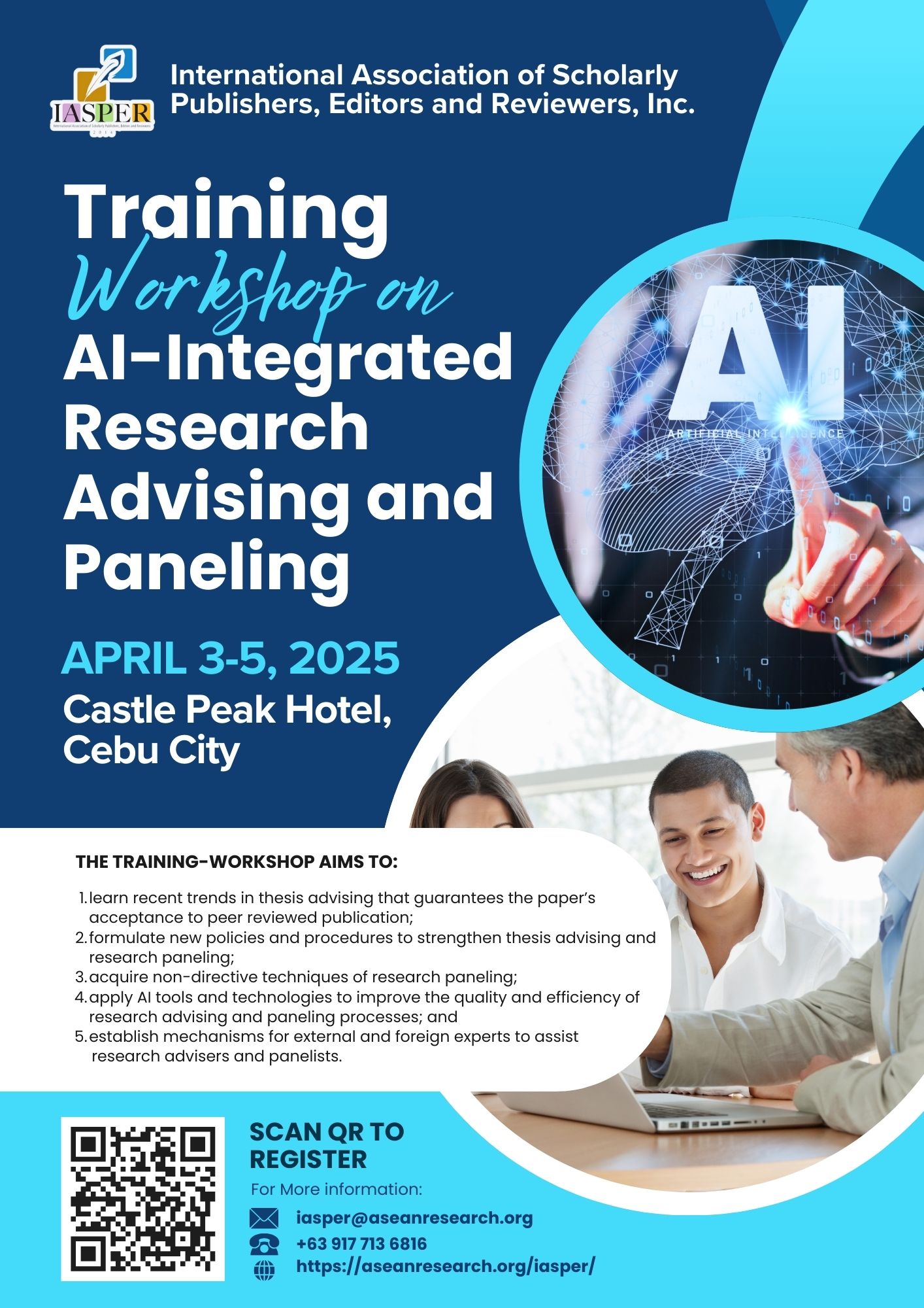 The International Association of Scholarly Publishers, Editors and Reviewers (IASPER) with the SEC Registration No. CN201433407 is inviting you to participate in the Training-Workshop on AI-Integrated Research Advising and Paneling on April 3-5, 2025 at Castle Peak Hotel, Cebu City, Philippines.