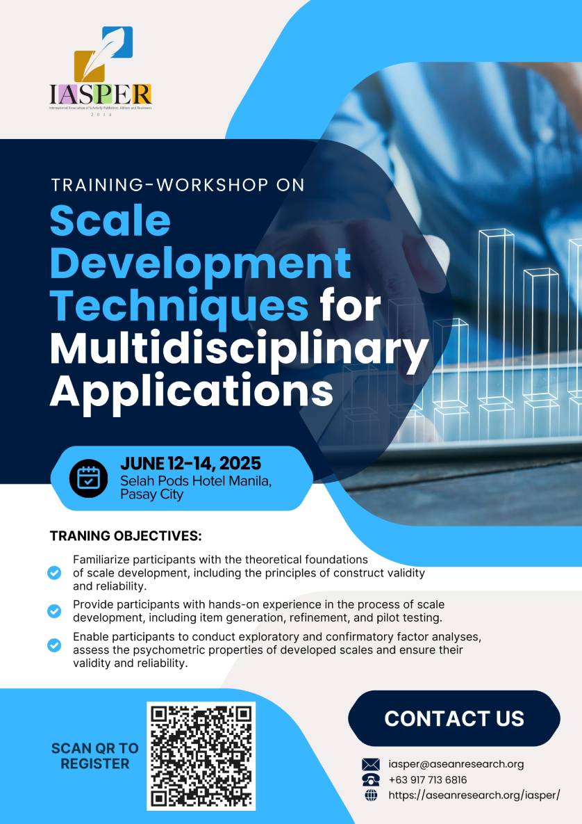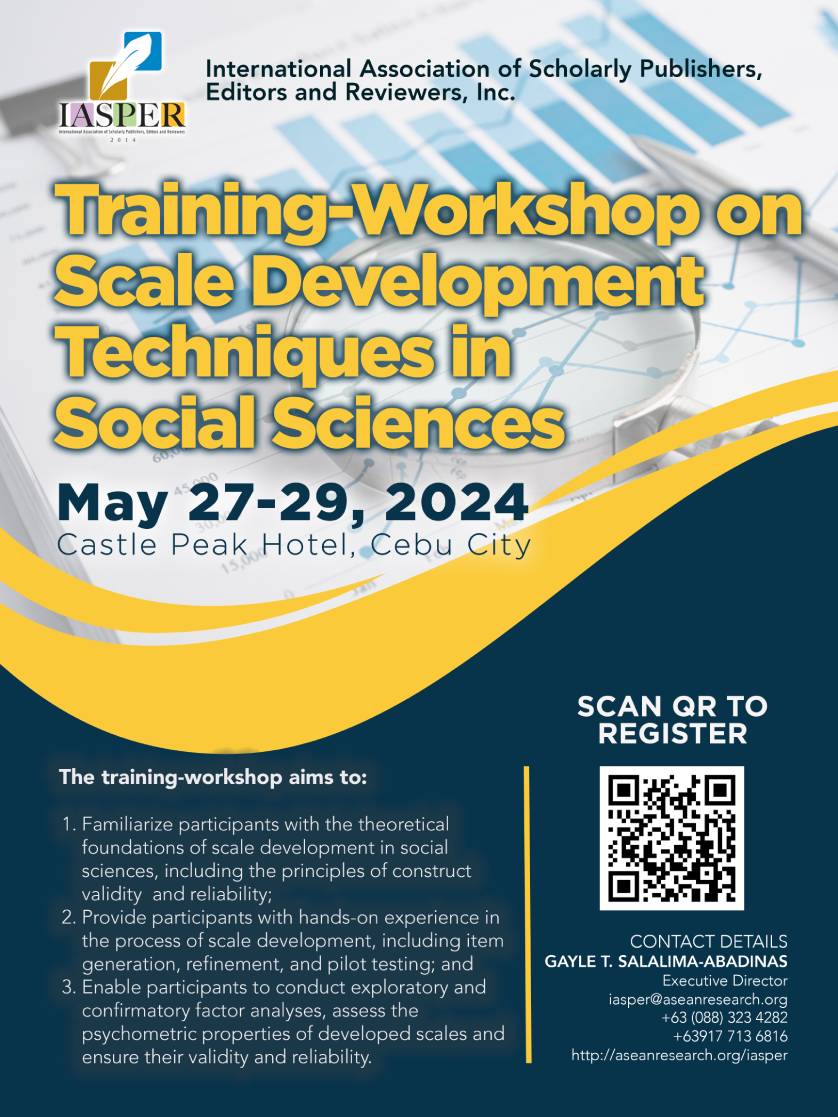 The International Association of Scholarly Publishers, Editors and Reviewers (IASPER) with the SEC Registration No. CN201433407 is inviting you to participate in the Training-Workshop on Scale Development Techniques in Social Sciences on May 27-29, 2024 at Castle Peak Hotel, Cebu City, Philippines.