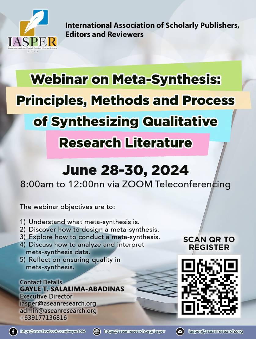 The International Association of Scholarly Publishers, Editors and Reviewers (IASPER) with the SEC Registration No. CN201433407 is inviting you to participate in the Webinar on Scoping Review: Methods, Approaches, and Steps for Research Literature Synthesis on September 26-28, 2024 via ZOOM Video Teleconferencing.