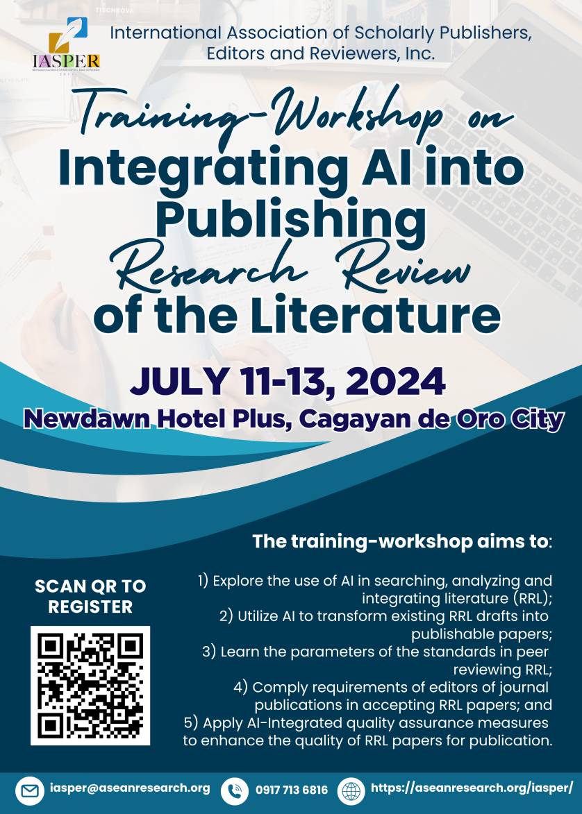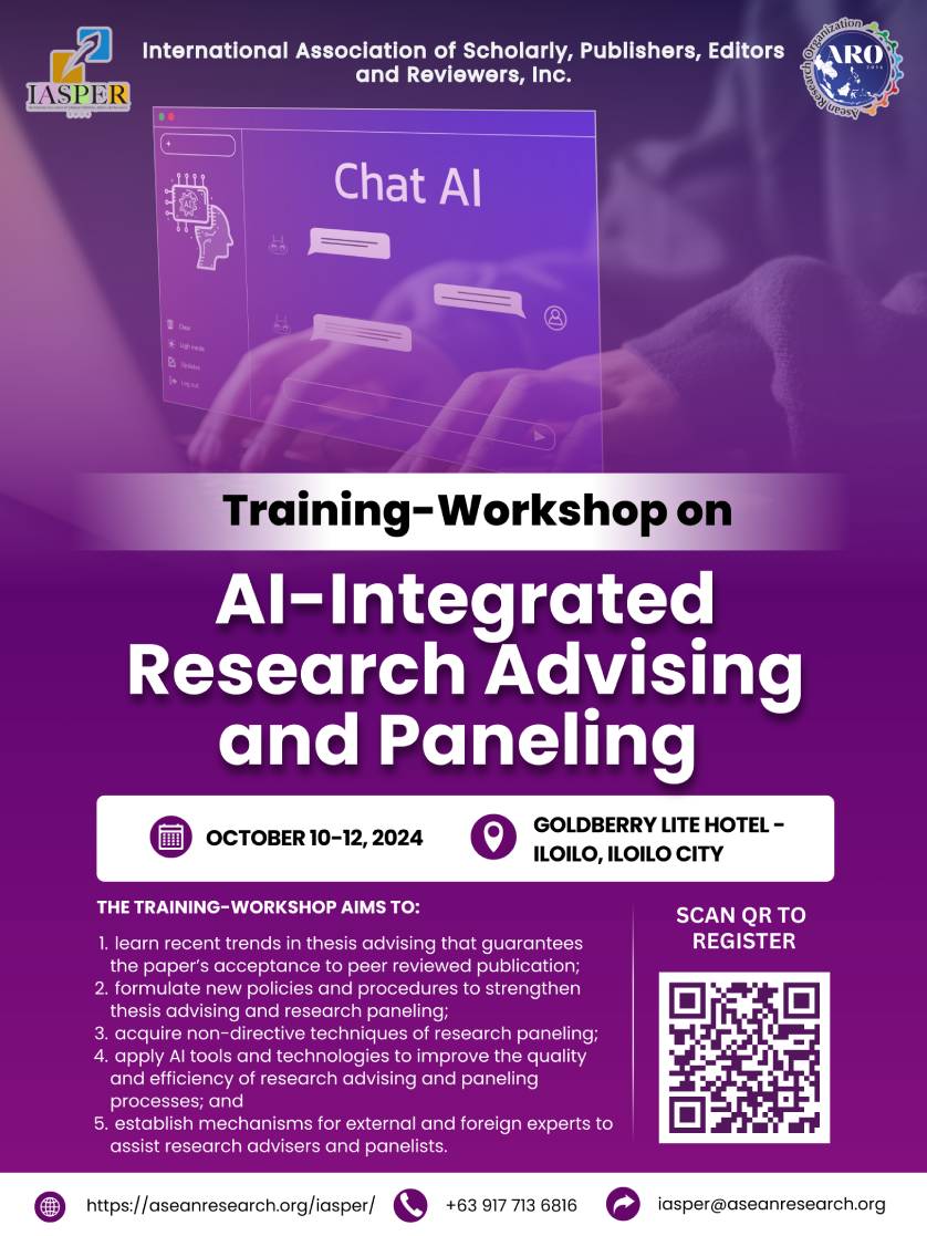The International Association of Scholarly Publishers, Editors and Reviewers (IASPER) with the SEC Registration No. CN201433407 is inviting you to participate in the Training-Workshop on AI-Integrated Research Advising and Paneling on October 10-12, 2024 at Goldberry Lite Hotel - Iloilo, Iloilo City, Philippines.