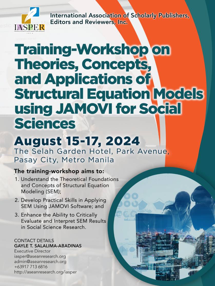 The International Association of Scholarly Publishers, Editors and Reviewers (IASPER) with the SEC Registration No. CN201433407 is inviting you to participate in the Training-Workshop on Theories, Concepts and Applications of Structural Equation Models using JAMOVI for Social Sciences on August 15-17, 2024 at The Selah Garden Hotel, Park Avenue, Pasay City, Metro Manila, Philippines.