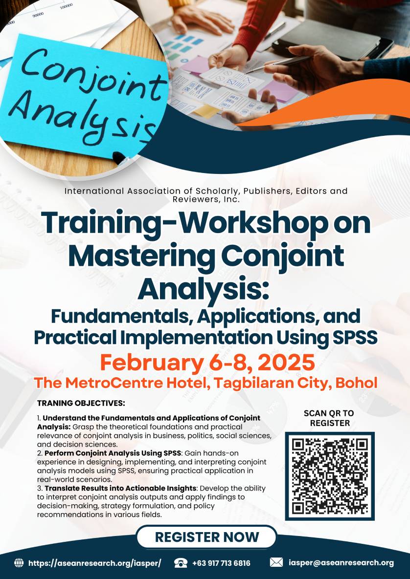 The International Association of Scholarly Publishers, Editors and Reviewers (IASPER) with the SEC Registration No. CN201433407 is inviting you to participate in the Training-Workshop on Mastering Conjoint Analysis: Fundamentals, Applications, and Practical Implementation Using SPSS on February 6-8, 2025 at The MetroCentre Hotel, Tagbilaran City, Bohol, Philippines.