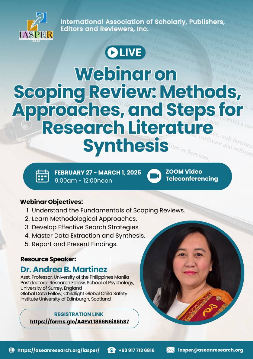 The International Association of Scholarly Publishers, Editors and Reviewers (IASPER) with the SEC Registration No. CN201433407 is inviting you to participate in the Webinar on Scoping Review: Methods, Approaches, and Steps for Research Literature Synthesis on February 27, 2025 – March 1, 2025 via ZOOM Video Teleconferencing.