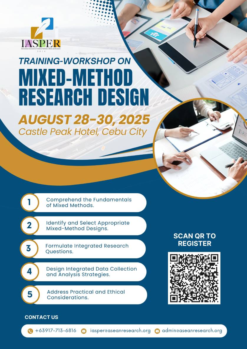 The International Association of Scholarly Publishers, Editors and Reviewers (IASPER) with the SEC Registration No. CN201433407 is inviting you to participate in the Training-Workshopon AI-Integrated Research Advising and Paneling on October 9-11, 2025 at Acacia Hotel Bacolod, Bacolod City, Philippines.