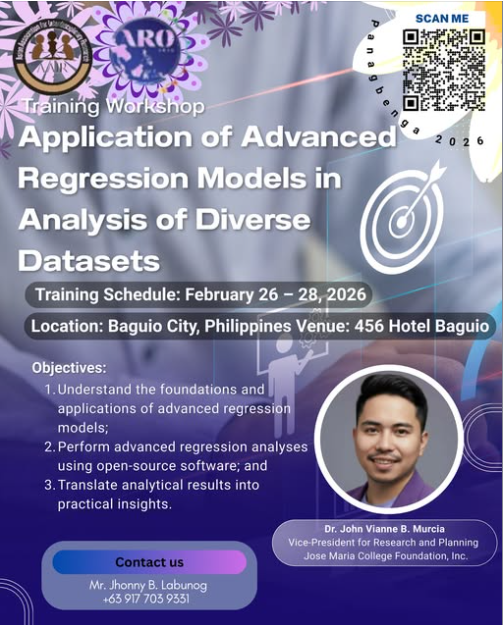 The Asian Association of Interdisciplinary Research, Inc. (AAIR, Inc.) will hold a training about “Application of Advanced Regression Models in Analysis of Diverse Datasets” on February 26-28, 2026* at 456 Hotel, Baguio City, Philippines. The program will be conducted face-to-face and will be fa