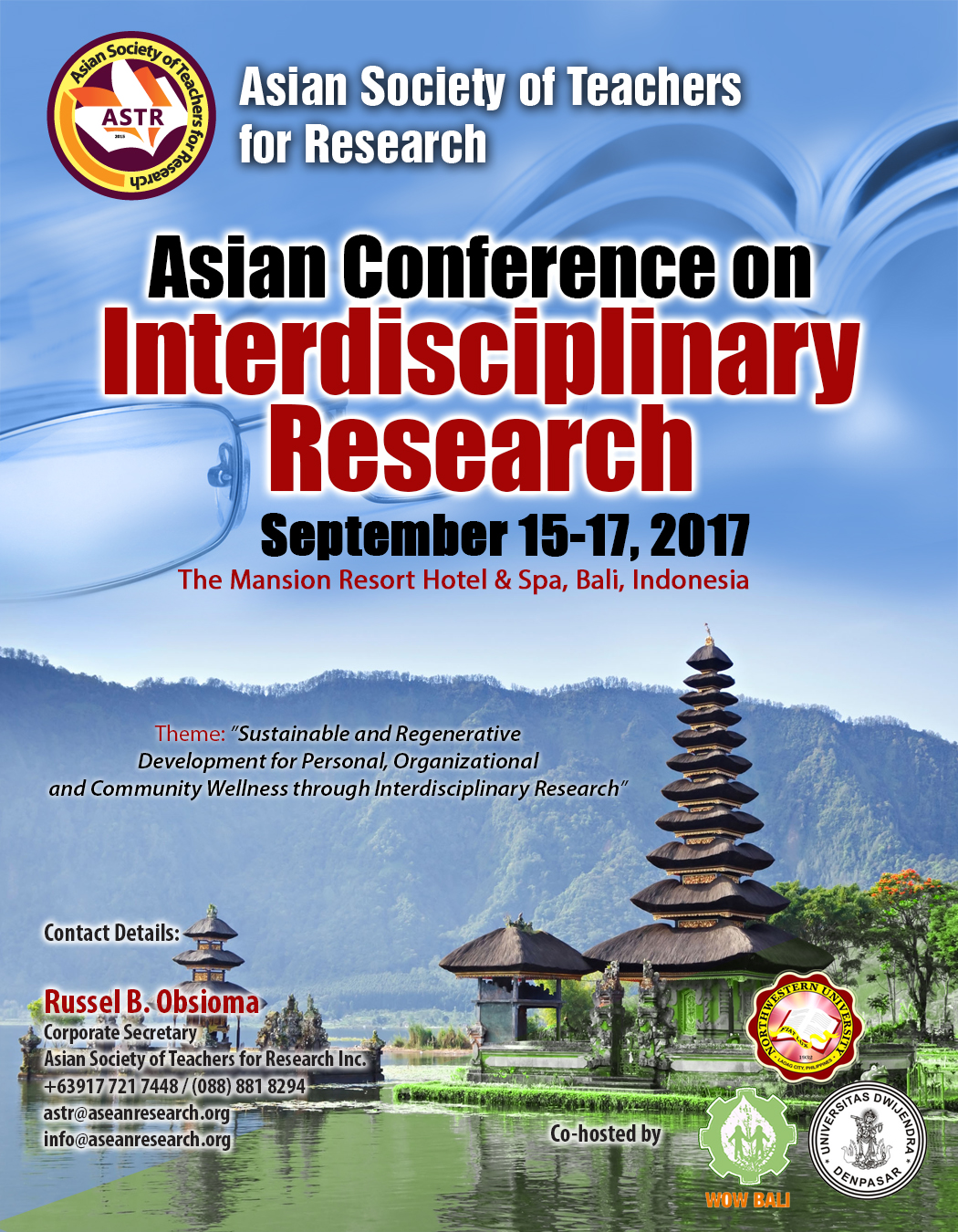 The Asian Society of Teachers for Research, Inc., an organization devoted to the advancement of pedagogy in the teaching of research in all academic levels, brings the Asian Conference in Interdisciplinary Research (ACIR 2017) on September 15-17, 2017 in the Islands of the Gods, Bali, Indonesia!
