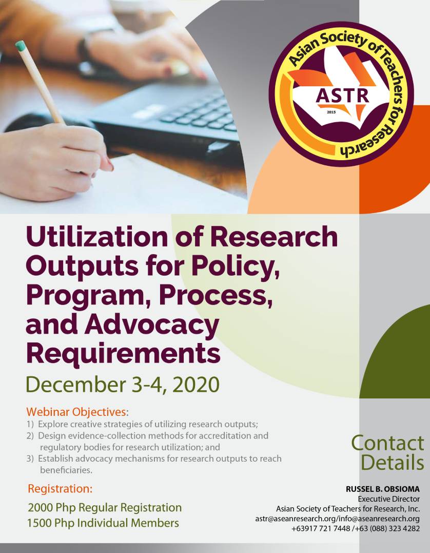With this in mind, the Asian Society of Teachers for Research Inc holds the virtual training-workshop on Utilization of Research Outputs for Policy, Program, Process and Advocacy Enhancements on December 3-4, 2020 (9:00 am to 5:00 pm, daily).