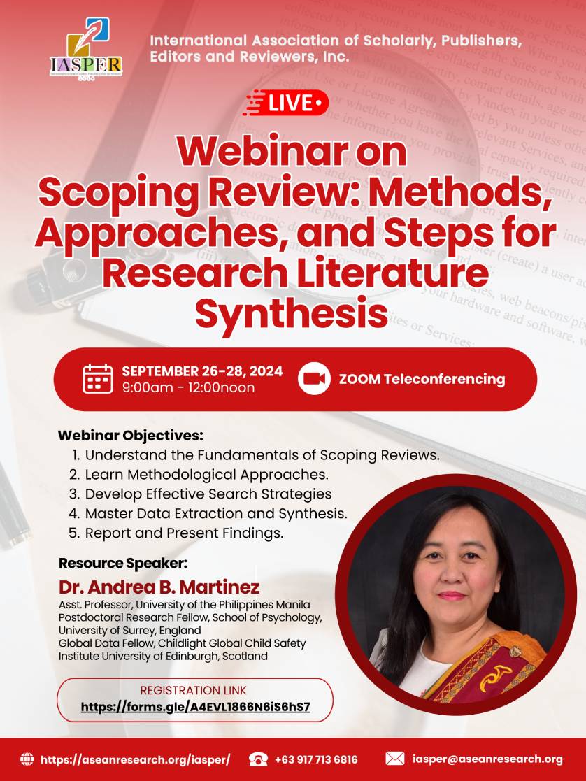 The International Association of Scholarly Publishers, Editors and Reviewers (IASPER) with the SEC Registration No. CN201433407 is inviting you to participate in the Webinar on Scoping Review: Methods, Approaches, and Steps for Research Literature Synthesis on September 26-28, 2024 via ZOOM Video Teleconferencing.