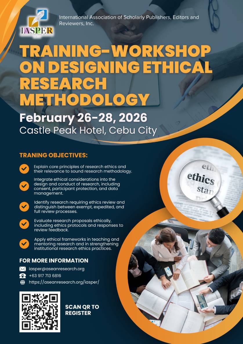 The International Association of Scholarly Publishers, Editors and Reviewers (IASPER) with the SEC Registration No. CN201433407 is inviting you to participate in the Training-Workshop on Designing Ethical Research Methodology on February 26-28, 2026 at Castle Peak Hotel, Cebu City, Philippines