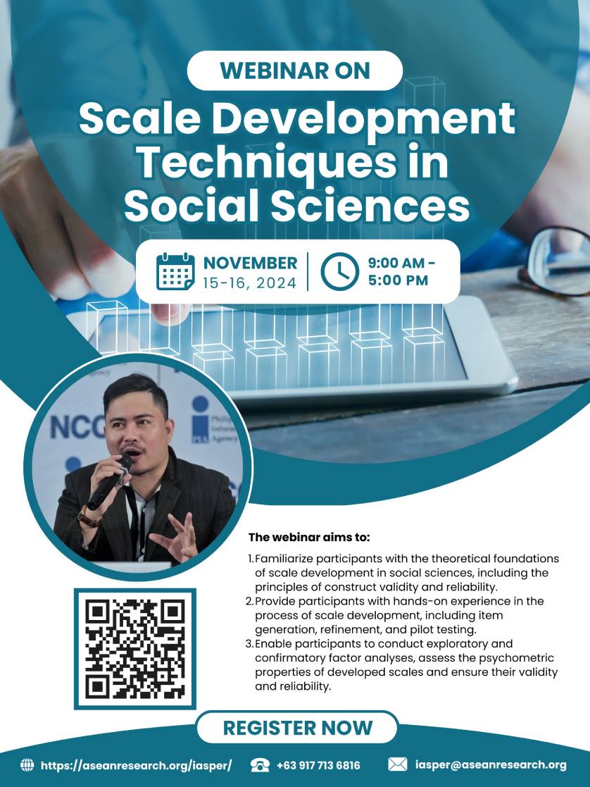 The International Association of Scholarly Publishers, Editors and Reviewers (IASPER) with the SEC Registration No. CN201433407 is inviting you to participate in the Webinar on Scale Development Techniques in Social Sciences on November 15-16, 2024 through ZOOM Video Teleconferencing.